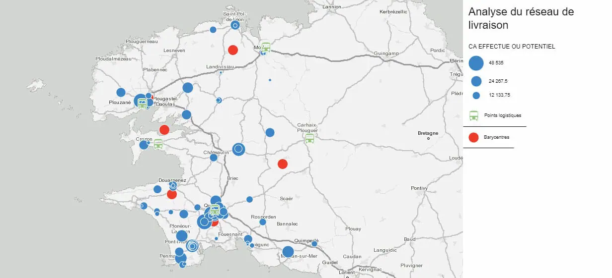 Avec nos logiciels de cartographie, vous avez la possibilité d’aller encore plus loin, sans avoir besoin de maîtriser des formules de calcul complexes. Le module Barycentre de Cartes & Données ou Articque Platform vous permet de déterminer un emplacement idéal en tenant compte d’une donnée cruciale pour vous (chiffre d’affaires, nombre d’interventions, nombre de clients…). De plus, son usage ne se limite pas à la logistique mais adresse de nombreux autres sujets : ressources humaines, pilotage commercial, satisfaction clients…
