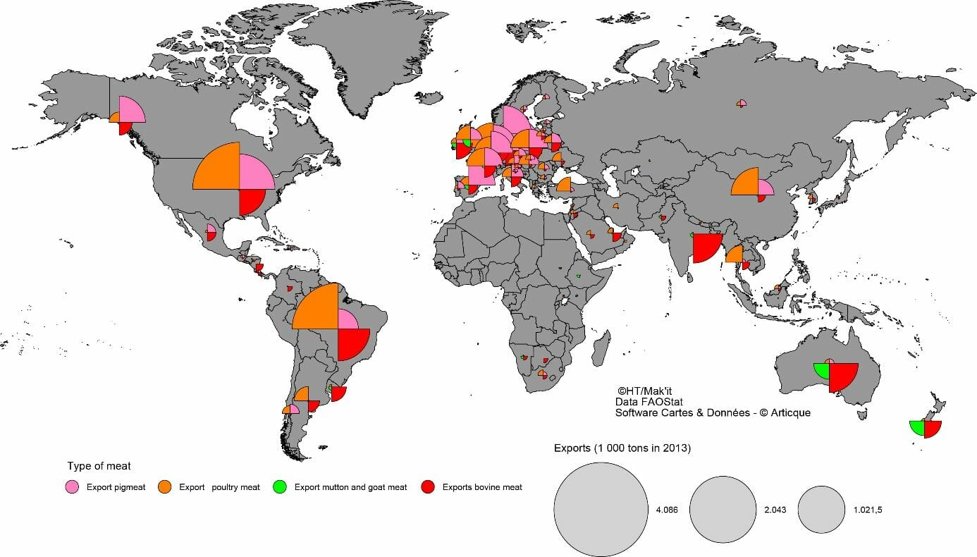 Dans cette étude d’Hervé Théry se trouve une autre représentation cartographique inhabituelle, la comparaison des exportations et importations de viande pour plusieurs types de viande (porcine, volaille, ovine/caprine et bovine), qui permet de repérer des filières d’exportation de pays :