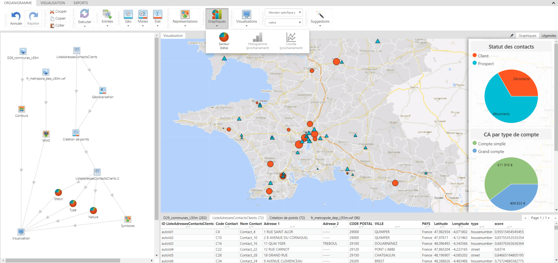 Cartes & Données et Articque Platform innovent pour devenir les solutions géo-décisionnelles les plus avancées du marché : elles intègrent une nouvelle fonctionnalité majeure (merci à notre équipe R&D). Vous pouvez désormais créer des graphiques globaux et les afficher à côté de vos cartes pour chaque niveau géographique : vous disposez ainsi d’un tableau de bord géographique complet pour piloter votre activité.