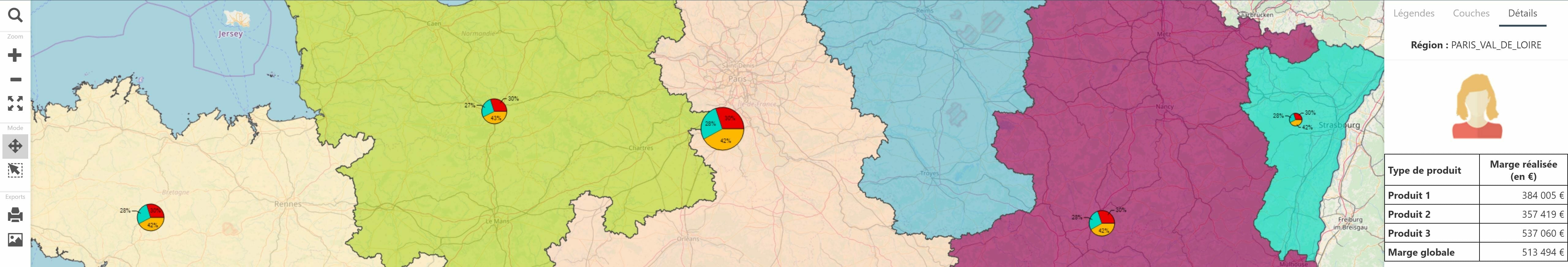 Avec un Atlas géographique interactif, vous suivez de près et en temps réel l’évolution de vos KPIs : chiffre d’affaires, marge, taux de pénétration, satisfaction clients… En cartographiant vos données, votre analyse est plus pertinente :