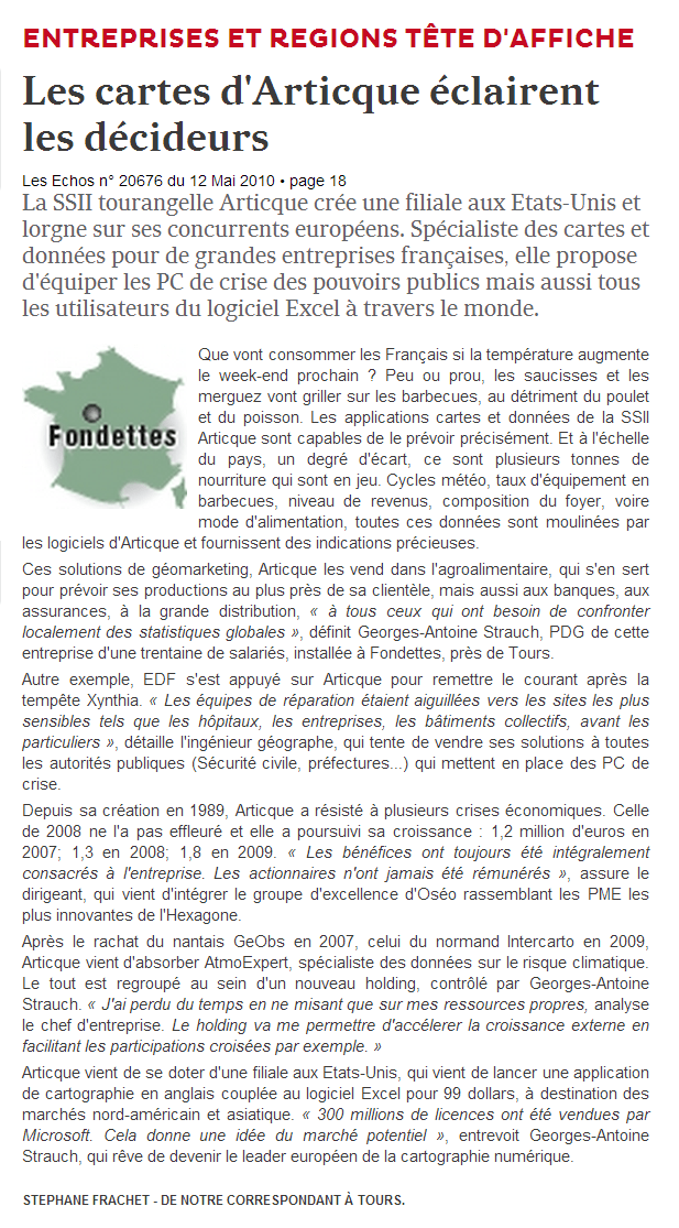 La SSII tourangelle Articque crée une filiale aux États-Unis et lorgne sur ses concurrents européens. Spécialiste des cartes et des données pour de grandes entreprises françaises, elle propose d’équiper les PC de crise des pouvoirs publics mais aussi tous les utilisateurs du logiciel Excel à travers le monde.