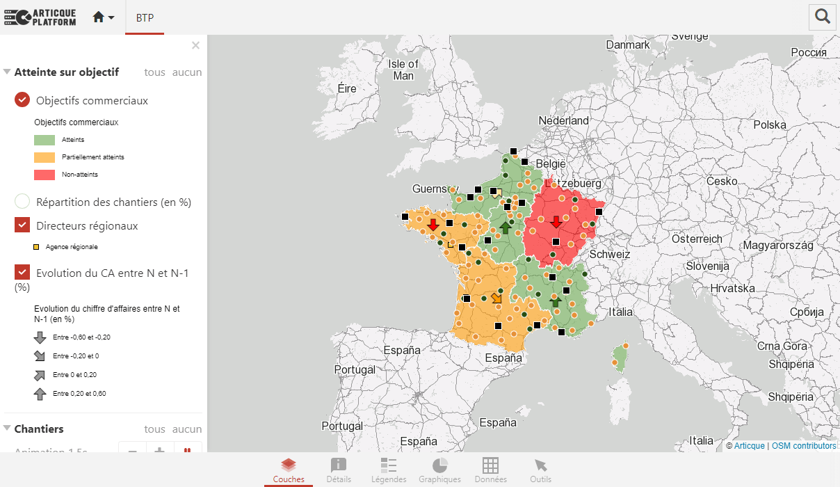 Visualisez d’un coup d’œil plusieurs indicateurs en jouant avec les différentes couches. Vous analysez ici l’atteinte des objectifs (aplats de couleurs) et l’évolution du chiffre d’affaires par rapport à l’an dernier et l’avancement de vos chantiers sur toute la France.