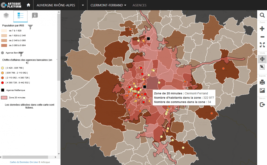 Un outil de géomarketing, comme par exemple un Atlas géomarketing, vous permet de visualiser votre réseau d’agences et de distributeurs ainsi que des données de marché et met en valeur de manière visuelle vos chiffres de performance. Vous confrontez les données internes sur la performance de votre réseau d’agences avec une analyse de l’environnement concurrentiel, augmentez votre maîtrise des territoires et optimisez vos résultats.