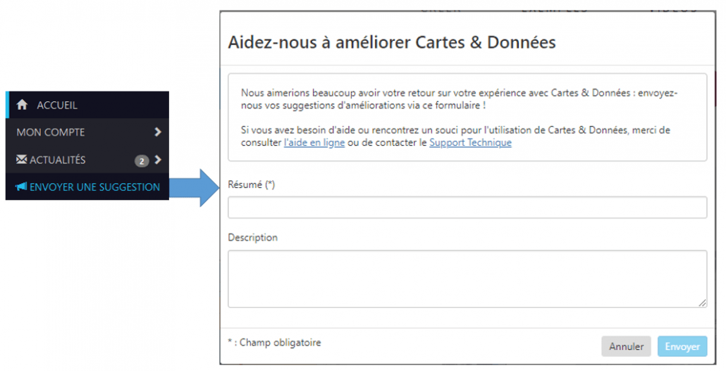 Les utilisateurs Cartes & Données Online peuvent désormais nous envoyer leurs suggestions d’améliorations grâce au nouveau formulaire dédié